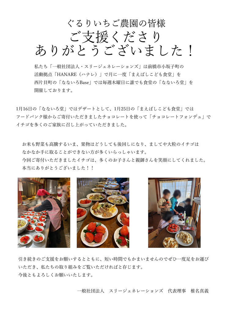 「なないろ堂」さん、「まえばしこども食堂」さん、いちごを囲んで楽しい時間を過ごしていただけたこと、とっても嬉しく思います🍓✨