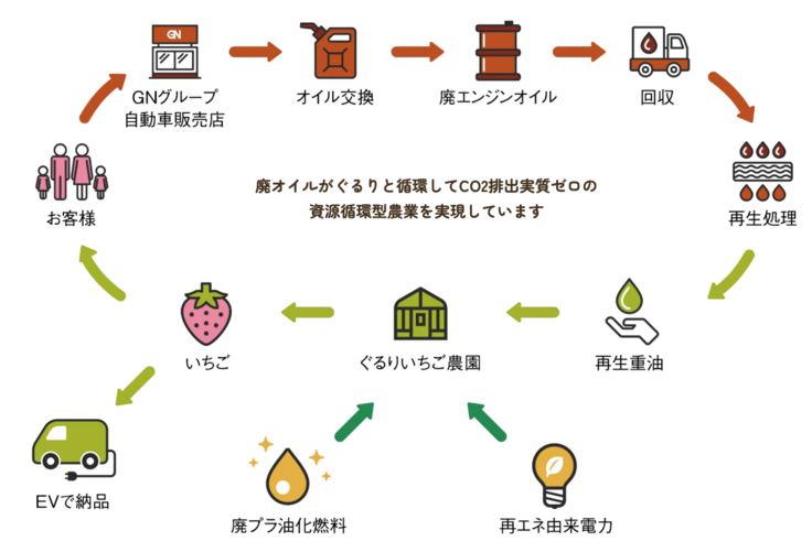 人々の生活を支えてきた自動車の廃エンジンオイルを再生オイル(再生重油)として生まれ変わらせ、その燃料を使っていちごを栽培し、また地域の人々に届ける。そんな仕組みから「ぐるりいちご農園」と名付けました。