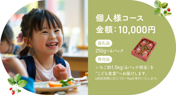 ・¥10,000のご支援で、いちご約1.5kg(6パック相当)をこども食堂および福祉施設に届けていきます。