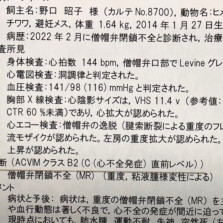VHSは主治医のお話ですと通常の数値は10.4ほどのようですが、ヒメは心臓が肥大しているため11.4という数値になっています。もう外科手術が必要なレベルだと言われました。