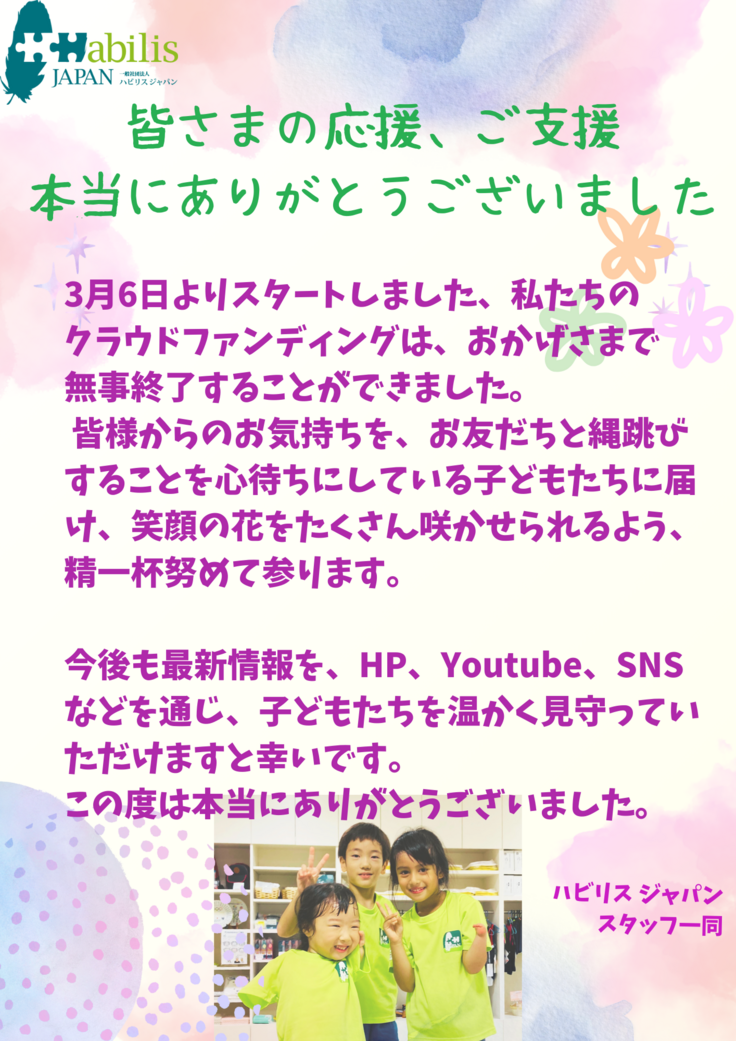 これからもハビリスジャパンは、子どもたちが何ごともあきらめずに、チャレンジし続けられる世界を目指して、一歩一歩前進して参りたいと思います。