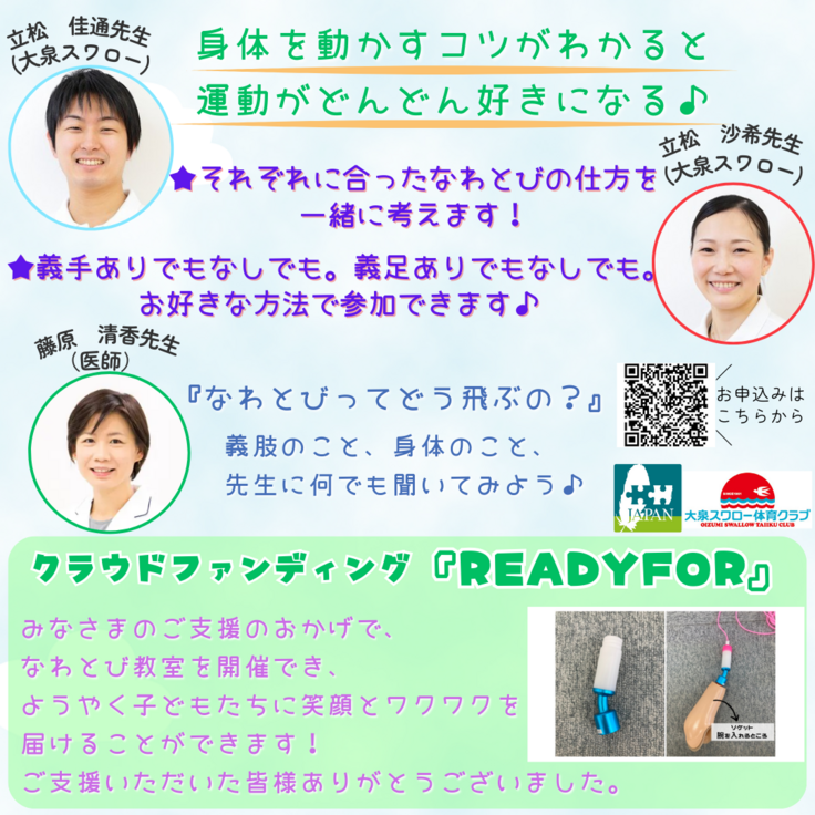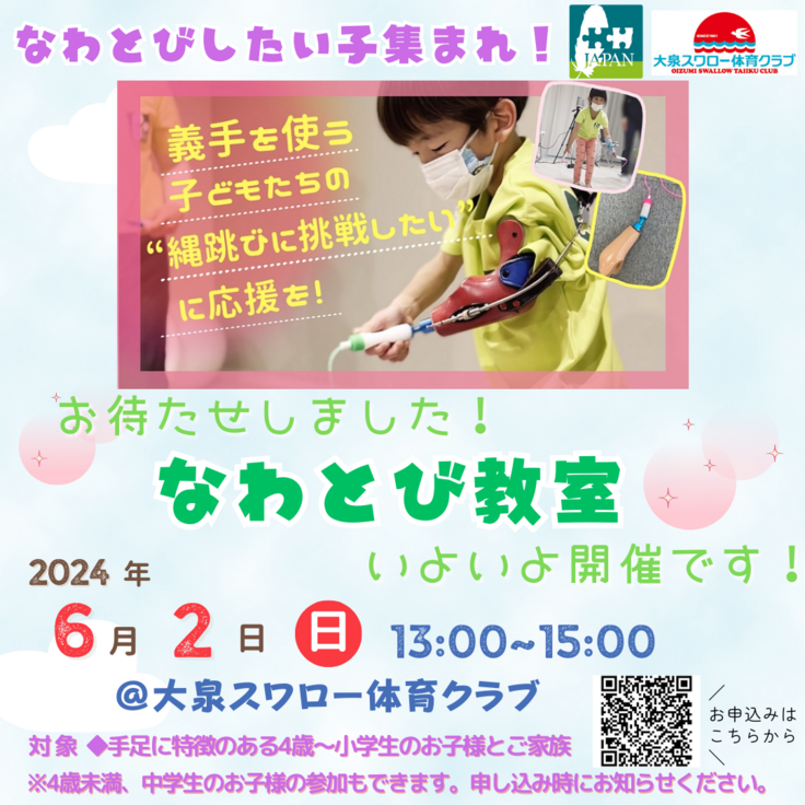 皆様のご支援・応援に支えられ、6月2日に『なわとび教室』を開催する運びとなりました。