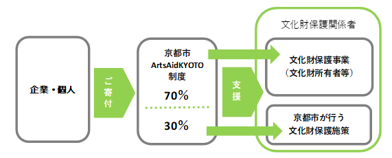 この制度はふるさと納税などの仕組みを活用して個人・企業の皆様からいただいたご寄付のうち、7割を文化財所有者等が行う文化財保護事業への支援に、3割を京都市が行う文化財保護施策に活用する仕組みです。
