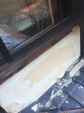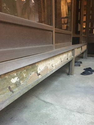 外壁の修理については、2階の壁の漆喰が剥落して雨が建物に侵入することや、主屋の縁の下の土壁が剥がれていることから、塗り直しを行います。また、軒の板金の劣化が進んでいるため葺き替えを行います。