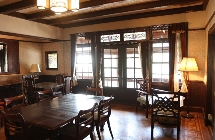 旧帝国ホテル外壁と同様の大谷石とタイル。格天井に寄木貼り床、電熱式暖炉と気品溢れる洋館です。
