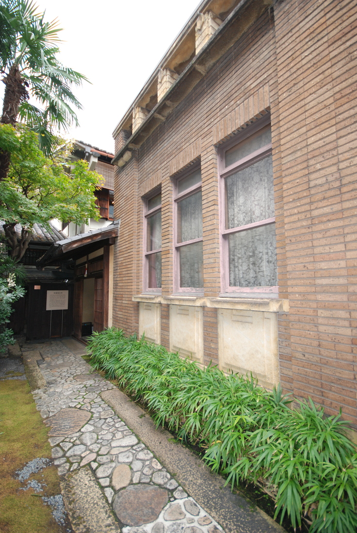 大正当時の流行であるフランク・ロイド・ライト風の意匠を洋館に採用した、伝統的な京都の「大塀造」です。数寄屋建築の名工「上坂浅次郎(※1)」が手掛け、関西近代建築の父「武田五一(※2)」も設計に関わっていたとみられます。また、本家係の大工主任と助手には、川崎家住宅を現在所有する「株式会社くろちく」代表の先祖である黒竹廣吉・梅吉が参与していました。