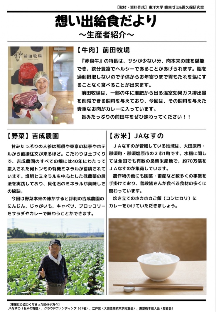 当日は私たちも学校に訪問させていただく他、テレビ朝日、下野新聞、朝日新聞などの取材も行われる予定です。皆様のご支援により想い出給食を実施することができることを蜂巣ゼミ、露久保研究室一同大変うれしく思っています!改めましてありがとうございます!