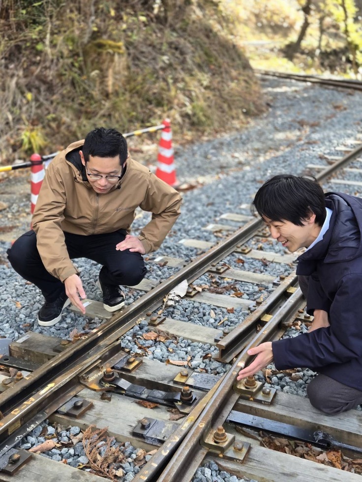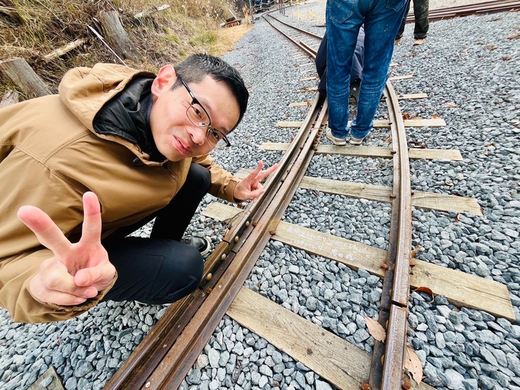 最後に、波賀森林鉄道のレールと恩田准教授のツーショットをお届けします笑(鉄道はもちろんお好きだとの事。)