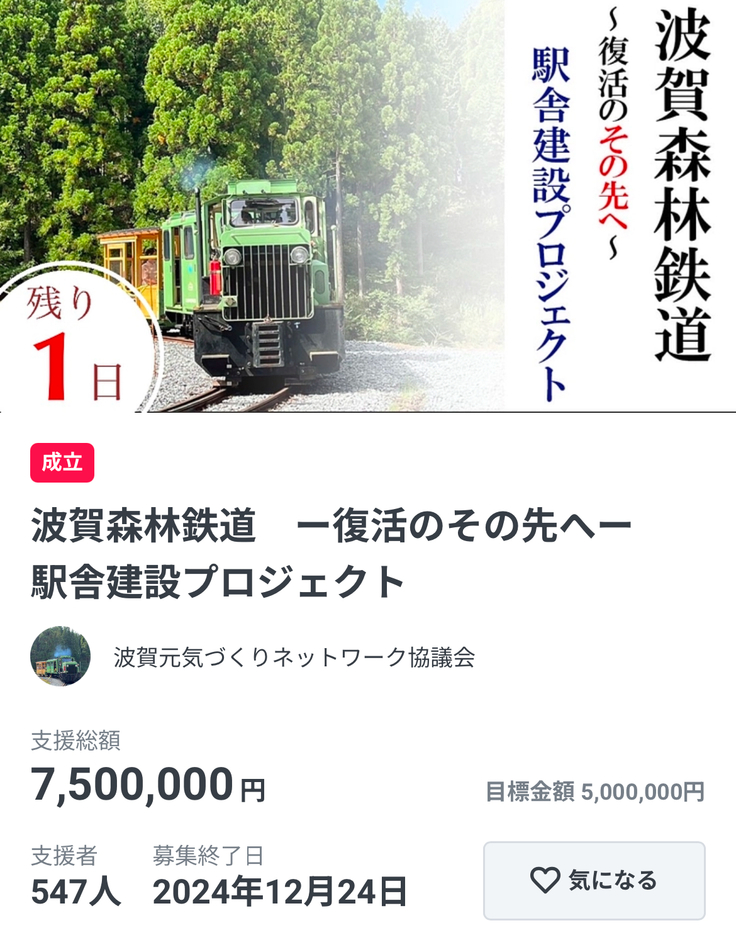 2か月前、648mの延伸記念式典の日に始めたこのクラウドファンディングプロジェクトですが、昨日の23時に無事終了し、なんと、支援総額が750万円になりました!(未決済分もあるので、実はもう少し増える可能性があります。)