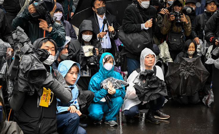 2023年3月/東京高裁(取材中の笠井・中央のブルーのカッパ)
