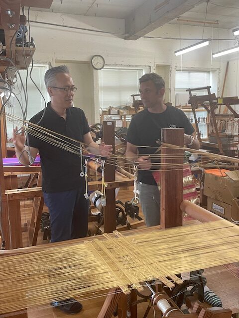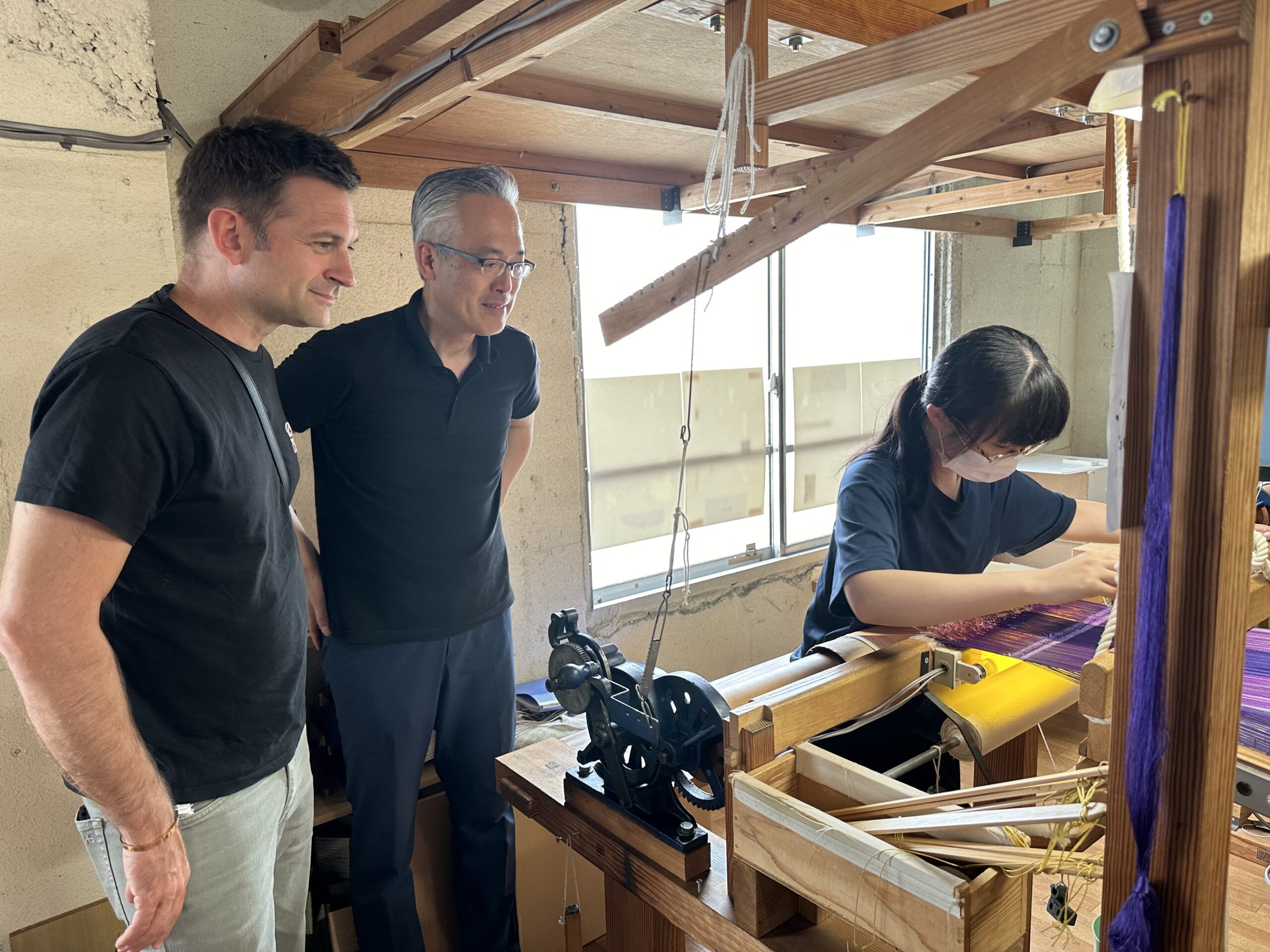 今回、福岡への来訪に合わせて6月19日午後に当カレッジを訪問し、博多織についての説明や、ジャカード織機を見ていただきました。