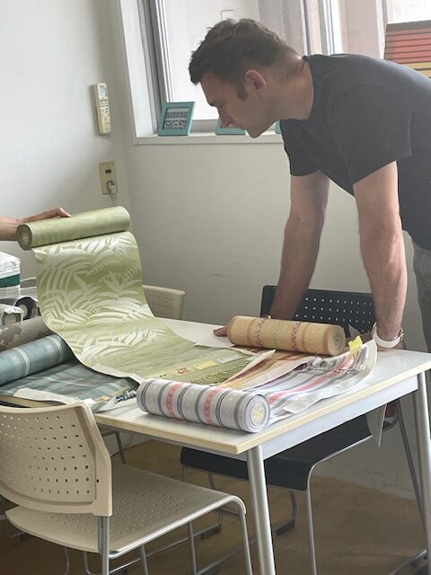 工房の見学の後、ニコライ・バーグマン氏はカレッジで制作した帯を手に取り、博多織の色彩や質感を丁寧に確認されていました。