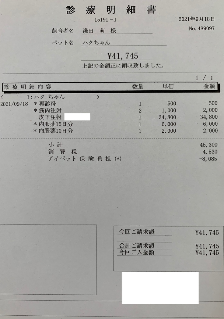 さらに、ハクは症状が重く、体重が重いため、薬の量が多くなり、とても高額になりますと病院から伝えられました。覚悟はしていたものの想像を遥かに超える額でした。