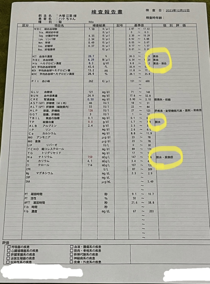 ↑血液検査の結果、脱水状態であると。