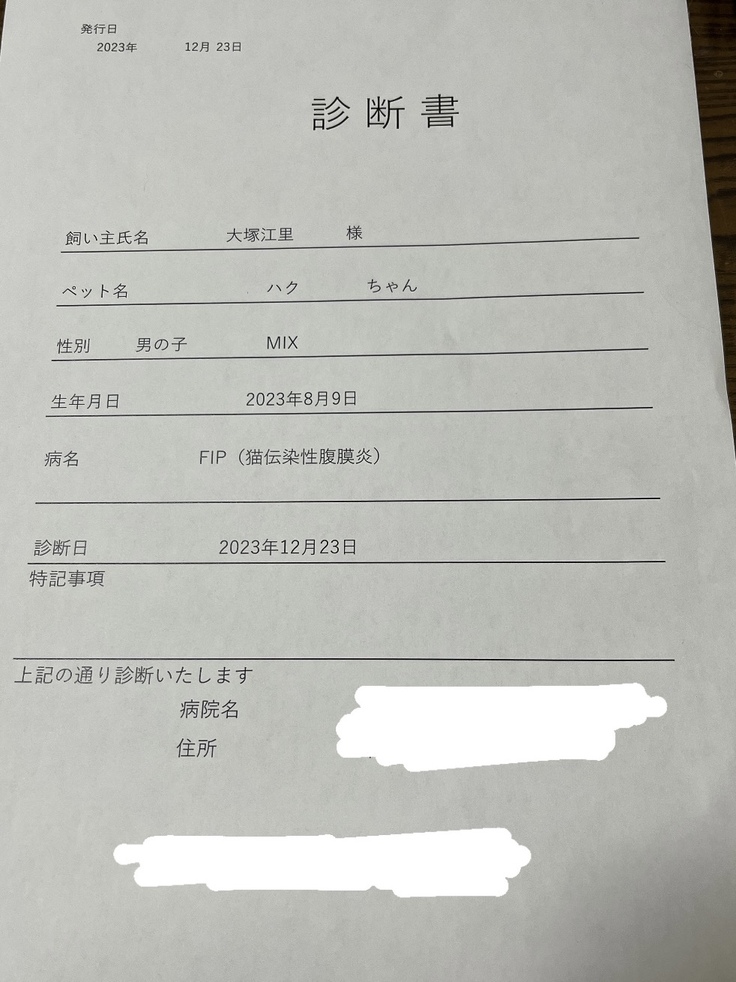 ハクを譲渡していただいた保護主様にも情報共有をし、FIP治療専門の診療所や先生を教えていただき、出来る限りのサポートをしてくださると言ってくださいました。