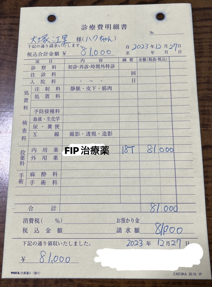 また、FIP治療は専門の病院受診が必要となり、病院が遠方(往復4時間)の為交通費もかかりますので…