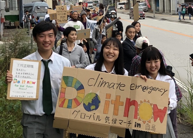 2019年6月、白馬SDGsラボのキックオフミーティングに白馬高校の生徒3人が参加してくれました。はじめは「エス・ディー・ジー・エスって何ですか?」と言っていたその子たちも、講演を聴くうちに「世界がやばい状況になっている!」と危機感を持ち、2019年9月にグレタさんが世界中の若者にグローバル気候マーチの開催を呼びかけた時、「私たちが白馬でグローバル気候マーチをやろう!」と動き出しました。