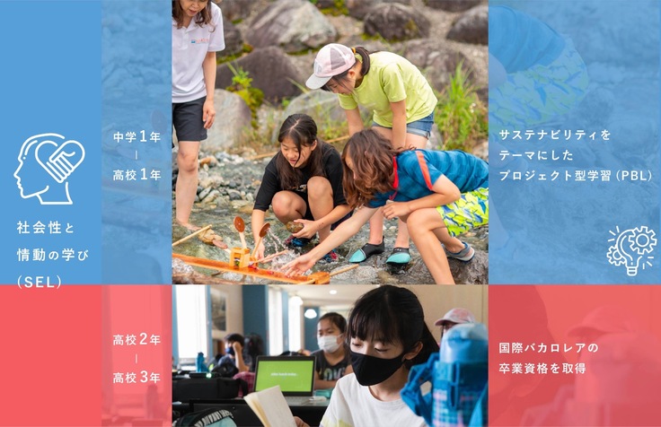 HISのサステナビリティ教育は、まず大自然の中で遊び、さまざまなプロジェクトを行い地域で活動する中で、自然を身近に感じ、地域を好きになるところからスタートします。中学1年から高校1年までは持続可能性をテーマにしたプロジェクト型学習(PBL)の手法を使い、体験や実生活に紐づいた社会に繋がる学びを行います。