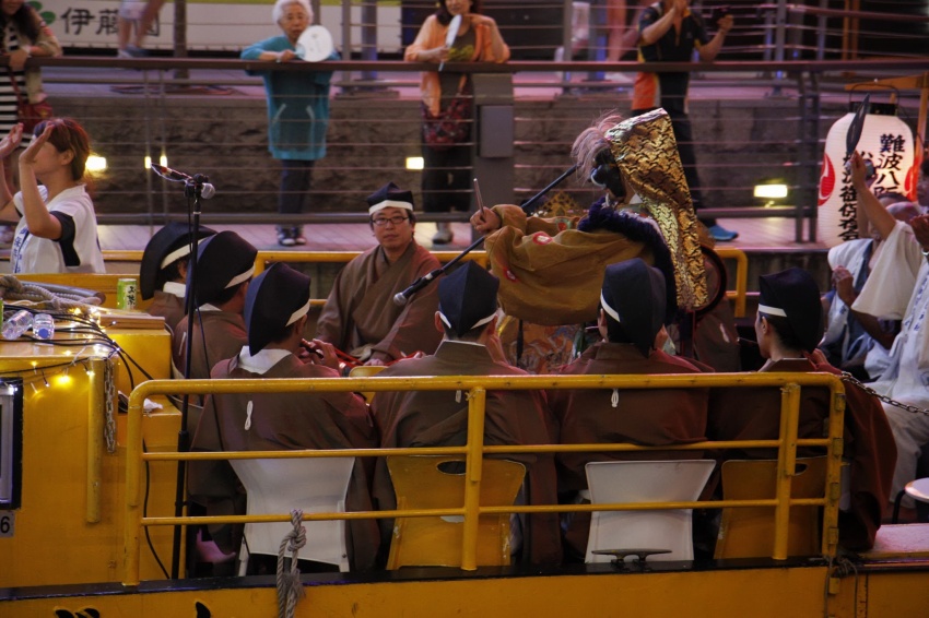分かりづらいでしょうが、船の中央で舞楽「落蹲(らくそん)」を上演しています。