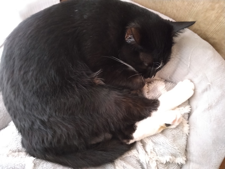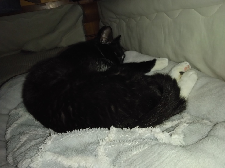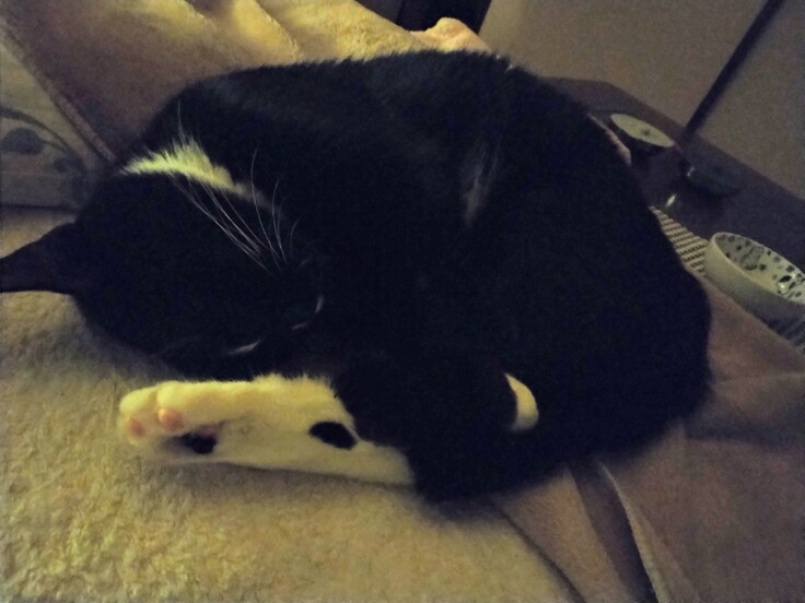 夜中、足を折りたたんで寝ている姿が可愛いすぎて写真撮ったあと私も💤