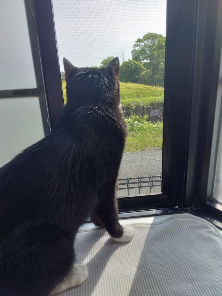 カラスがたくさん飛んでいて興味津々🐱(うちの良いところは窓がたくさんあってど田舎景色を堪能できるとこかな…)