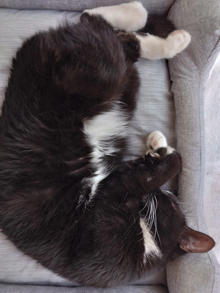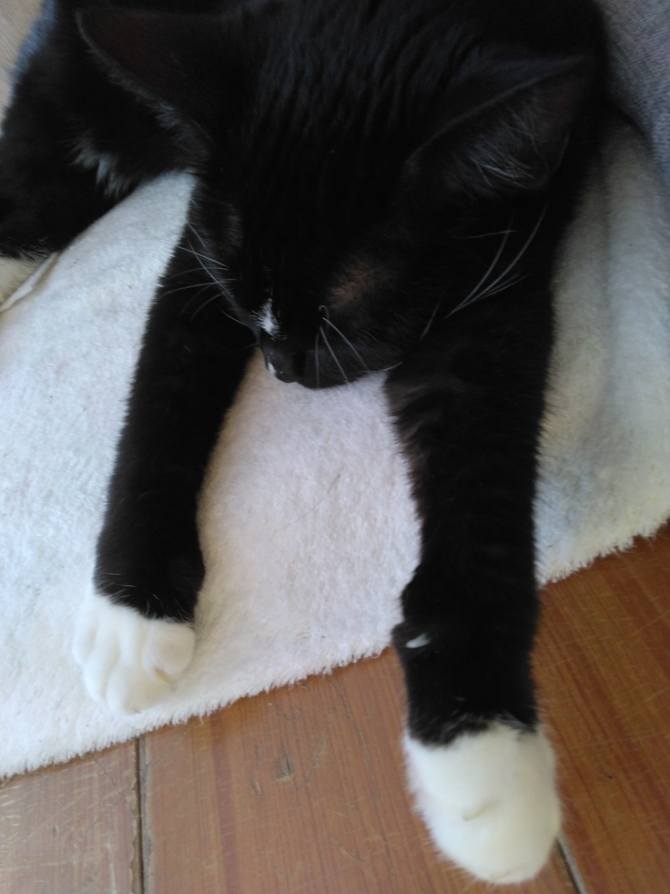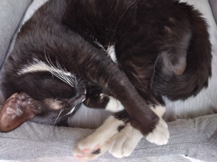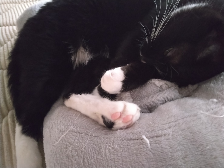 後ろ足の出ている爪2本を、いつも噛んで引っ張ります。