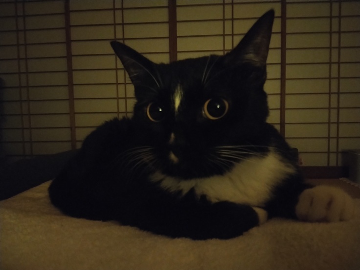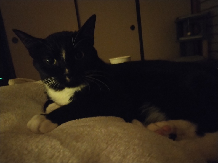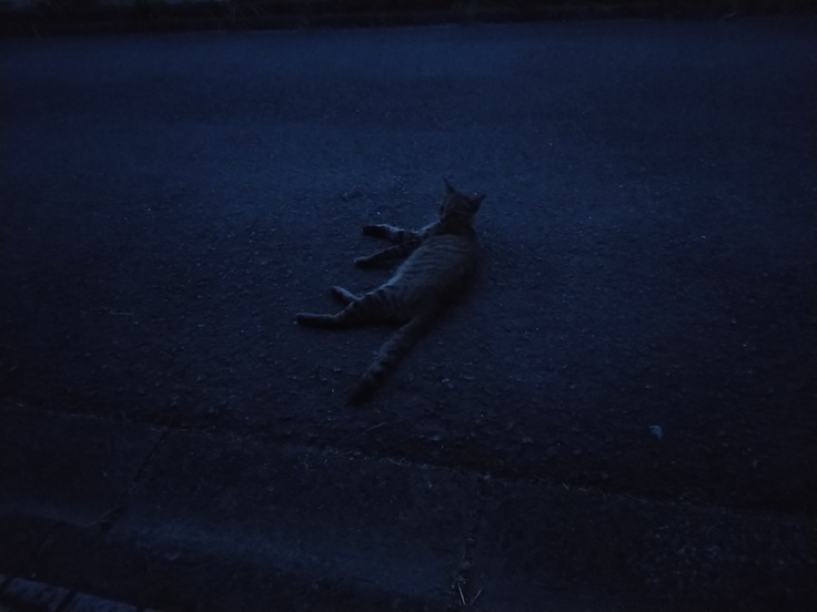 懐中電灯持って外に見に行くと、白にグレーの柄の1番大きい子(1番不仲)から逃げてうちの2階の屋根に登ってました。