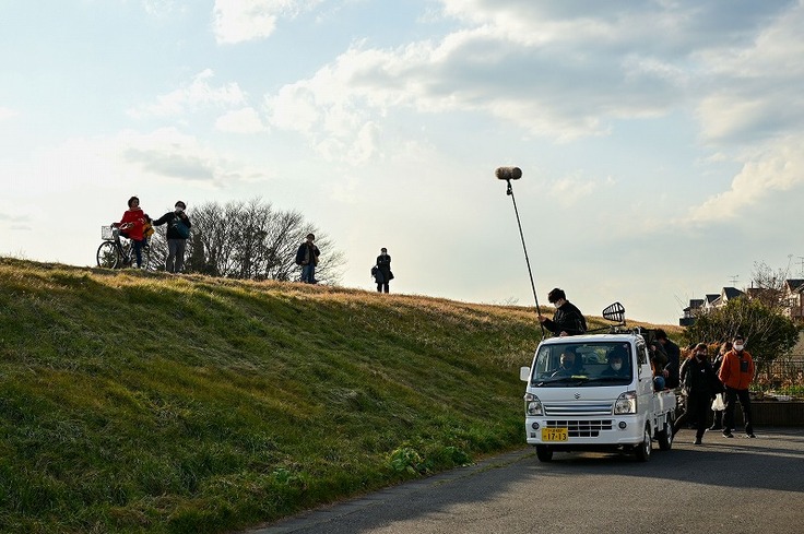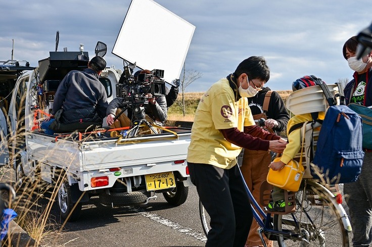 土手で自転車を走らす撮影をしました。自転車をこいでいるのは??