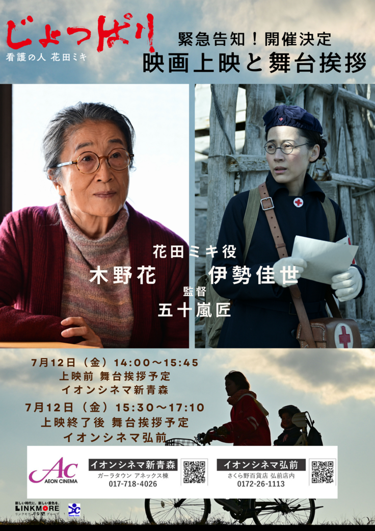 <7月12日(金)>緊急告知!上映会と花田ミキ役木野花さん・伊勢佳世さんの青森での舞台挨拶のお知らせ