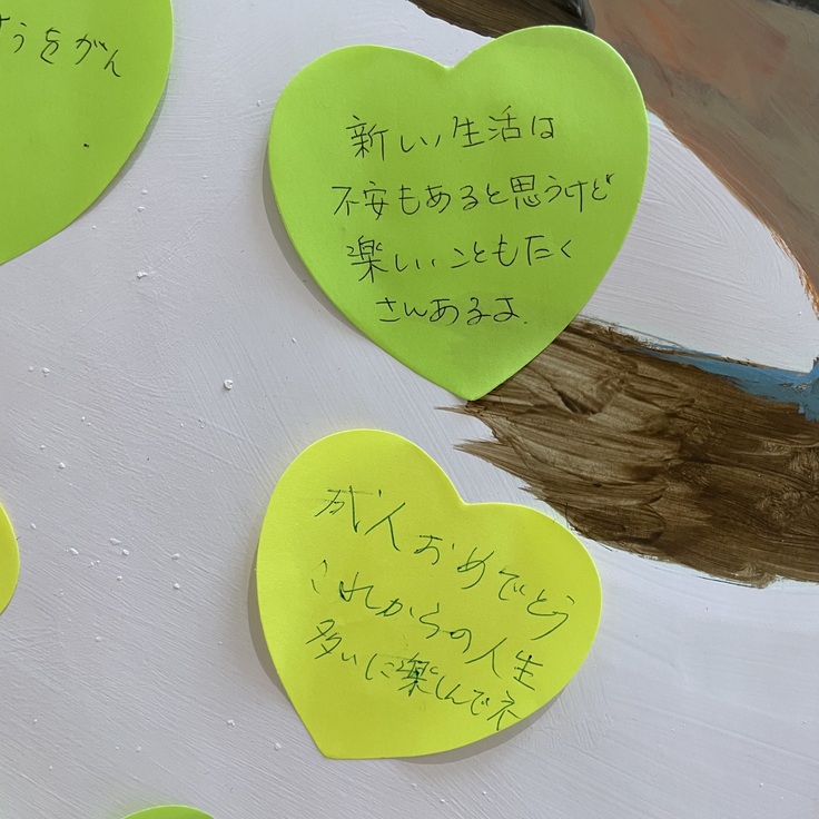 会場に来てくださった方々には、ハートの付箋に新成人への応援メッセージや新生活へのご自身の意気込み・願いごとなどを書いてもらい、地域の高校生に描いてもらった木の絵に貼って、みんなでたくさんのお花を咲かせました。