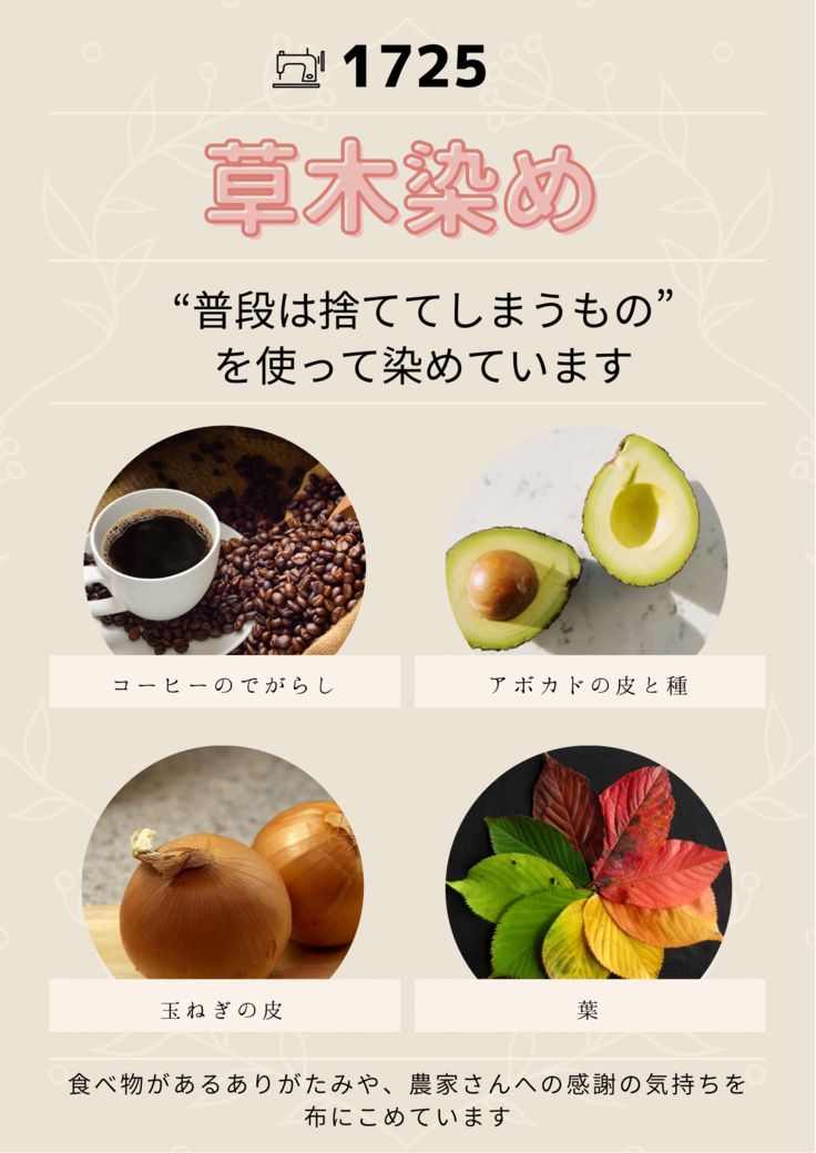 また、作品はテーマをもって制作しており、現在は野菜の皮や鑑賞し終えた草花、珈琲の出がらしなど、普段は捨ててしまう物から布を染め、“食べ物があるありがたみ”や、背景にある生産者さんの苦労に目を向けた“生産者さんへの感謝”を作品に込めています。作品を通じて、私自身が大切だと考えているメッセージをこれからも発信していきたいと思います。