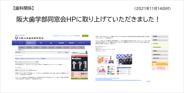 阪大歯学部同窓会のホームページに掲載いただいました。