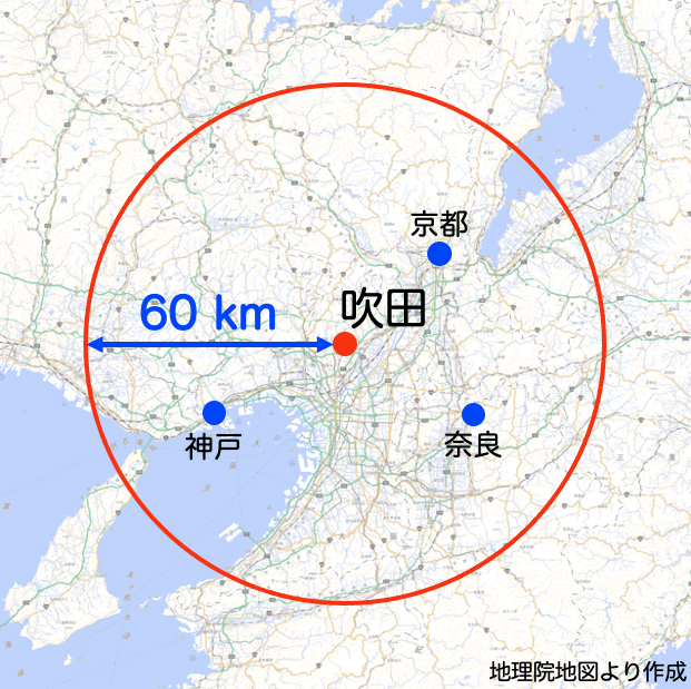 観測結果は大阪大学吹田キャンパスから半径60 km以内の範囲で提供されます。大阪府北部のほか、神戸市、京都市、奈良市なども観測範囲です。ただし建物や山といった障害物の影響で、一部ご利用いただけない地域もございます。