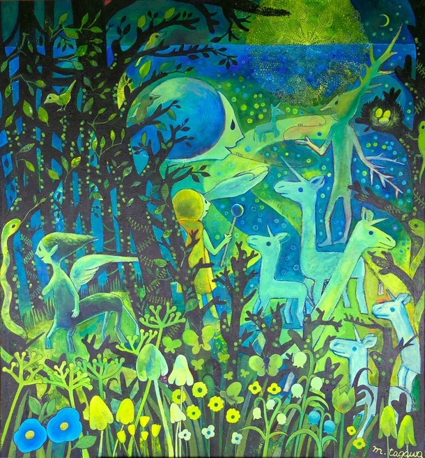 そこに登場する生き物たちを、ご紹介したいと思います。 ・闇につつまれた夜の森(過去の世界)に住むへび ・森を抜けた先(未来の世界)と、水平線上にかがやくおひさま ・過去に瀕死の傷を負いながらも、未来に光が見えて笑顔をみせているケンタウロスの(ような)子 ・みんなを導いてくれる、目には見えない精霊の大きな横顔 ・精霊に導かれ、未来へ進むステッキを持った子 ・群れを離れ、1人で歩きはじめた一角ろば(のような生き物) ・泡のような光の粒(森の木漏れ日と水面のかがやき)
