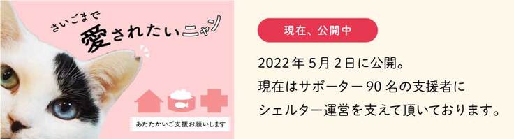 このプロジェクトは2022年5月2日に公開されました。現在のサポーター数は86名(キャンペーン型を含む)支援金はマンスリー217,000円(目標金額30万円)です。公開した当時飼育する保護猫は70匹おり、光熱費の支払いができなくらいに困窮しておりましたが、支援者の方が徐々に増えていき今は、シェルター運営が計画的に行えるようになってきました。これまでのサポーターの皆様方に、心から感謝しております。