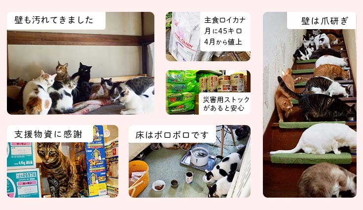アマゾンの欲しいものリストから、毎月フードや消耗品が送られてきています。その支援物資で、今は生き延びております。皆様「少しですが」とのメッセージを書かれますが、少しであっても助かるのです。私の預貯金は、保護猫カフェ運営時の赤字補填(約900万円)で全て、使い果たしました。今は年金のみで暮らしております。猫への支援物資を継続して送って頂くことで、シェルター運営は安定していきます。引き続き物資のご寄付をいただけると、とても助かります。