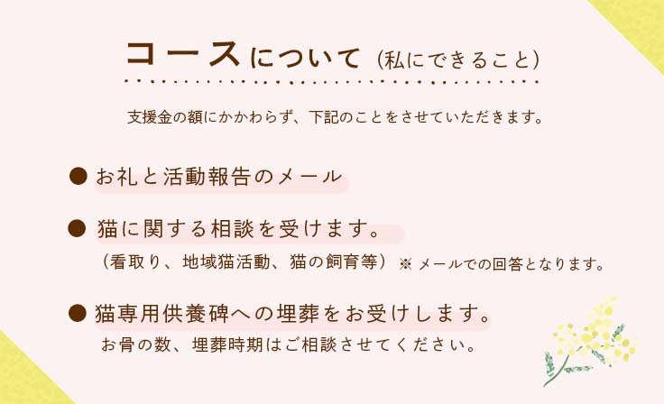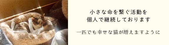 変更が遅れました理由は、2023年夏に、私が胃がんステージ4と診断されたことに有ります。ここ1年半は猫の飼育を行いながら、治療にも専念しておりました。最初の余命宣告は半年でしたが、その後の抗がん剤治療が上手く効き、体力も回復し、なんとか復活することができました。万が一私が倒れた時の対策は行っております。猫達も多くが高齢となり私の活動は、そう長くは有りません。どうか可能な範囲での、ご支援を頂きたくお願いをいたします。