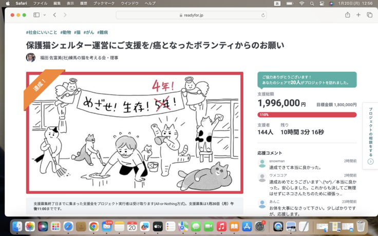 12月19日に公開のクラウドファンディング(家賃1年分のお願い)ですが、1月17日22時22分に目標金額を達成することができました。応援、ご協力、ご心配を頂き心から感謝しております。本来なら終了後に、金額等をお知らせするところですが明日が抗癌剤治療の日で、朝の4時に起き病院に行くため、本日は早寝となります、成立前のご報告となりますが、先にお礼を申し上げます。(達成して時にも熟睡しており、達成の瞬間を見ることができず残念でした。)ありがとうございました。