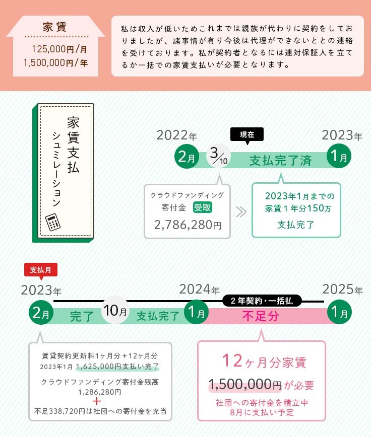 2023年1月までの家賃(1年分)の支払いは完了しており、残り1年分を払うため、最大限に節約をして寄付金を積立て、貯めております。支払い期日は8月で、現時点での積立金は80万円となっております。