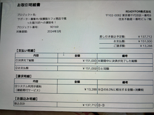 本日、3月分の支援金190、608円を受け取りました。ありがとうございます。
