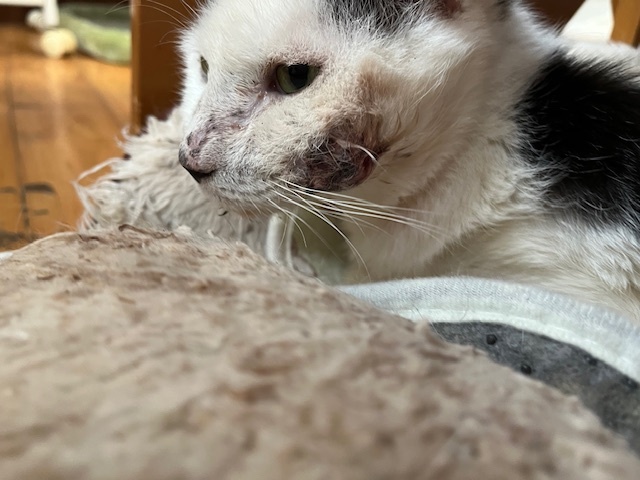 化膿の処置後、腫瘍が見つかり、今後は痛みを和らげる治療に切り替える方針です。