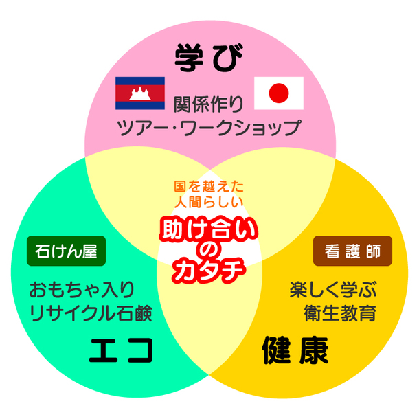 私たちは、この仕組みに、アフリカで実際に効果を上げているWHOのプロジェクト「Hope Soap」とを組み合わせ、日本とカンボジアをフィールドに、ワークショップを展開することで、リサイクルも教育も交流も合体させたプロジェクトとしてスタートします。