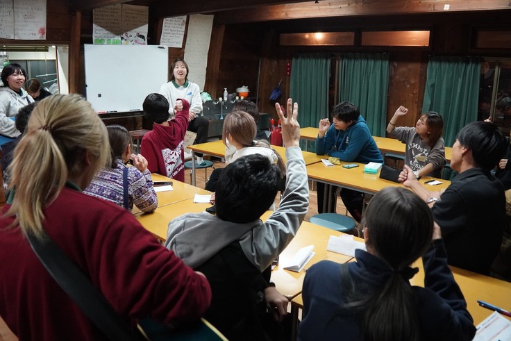 バスの中から研修の目的を共有し、早速レクリエーションの練習やキャンプについての話しなどに花をさかせました。