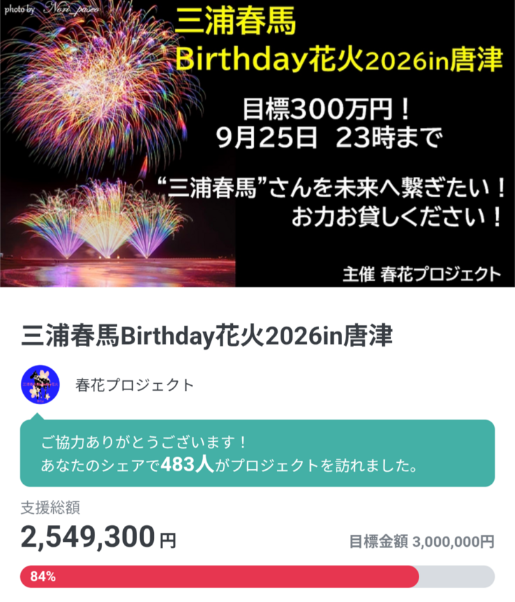 三浦春馬Birthday花火2026in唐津を応援いただき、ありがとうございます