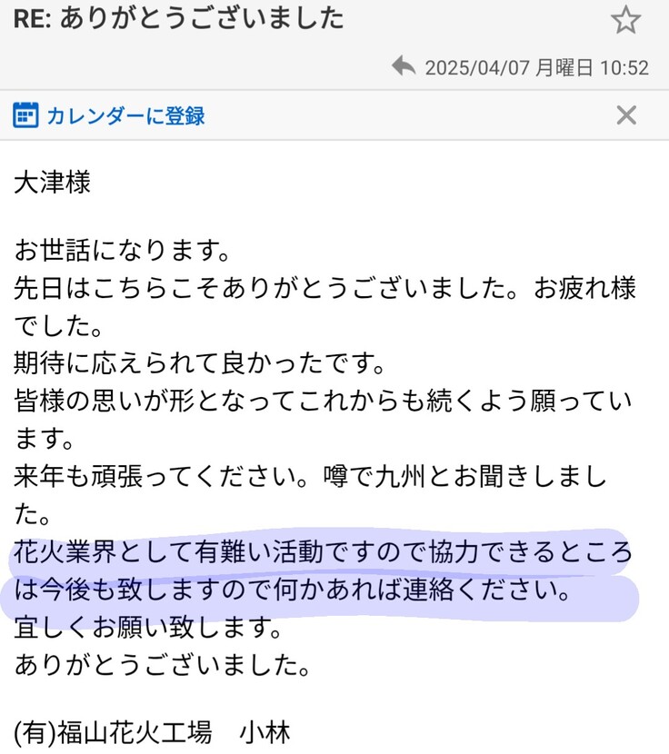 実は、「2027は青森で」というお話は、in千葉終了後の福山花火工場小林社長からこんなメールをいただいたところから始まっておりました