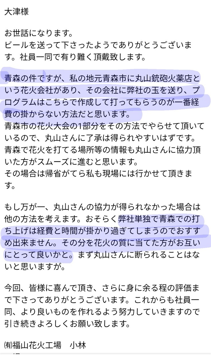 「何かあったら連絡ください」という社交辞令を、絶対に社交辞令で終わらせないことが、この道を行くために必須のド厚かましさでございますから、「実はいつか青森での開催を夢みているのですが、万一貴社に花火をお願いした場合、運搬費はいかほどでしょうか」とすぐさま返信いたしましたら