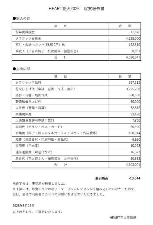 来年は、近隣のご迷惑にならないよう、警備員を増員配置ができるように予算に計上していきます。HEART花火2026に向けて、支出の見直しを行い、安全な催しの遂行、また当日の準備の負担軽減のため運営方法をしっかり考えていくつもりでおります。