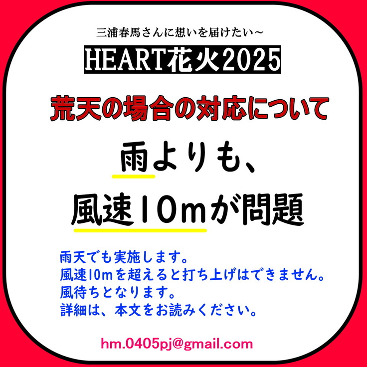 週間天気予報が発表され、荒天の可能性がある場合は、READYFORメールシステム及びHEART花火からのメールでお知らせいたしますので、必ずご確認いただきますよう、お願いいたします。