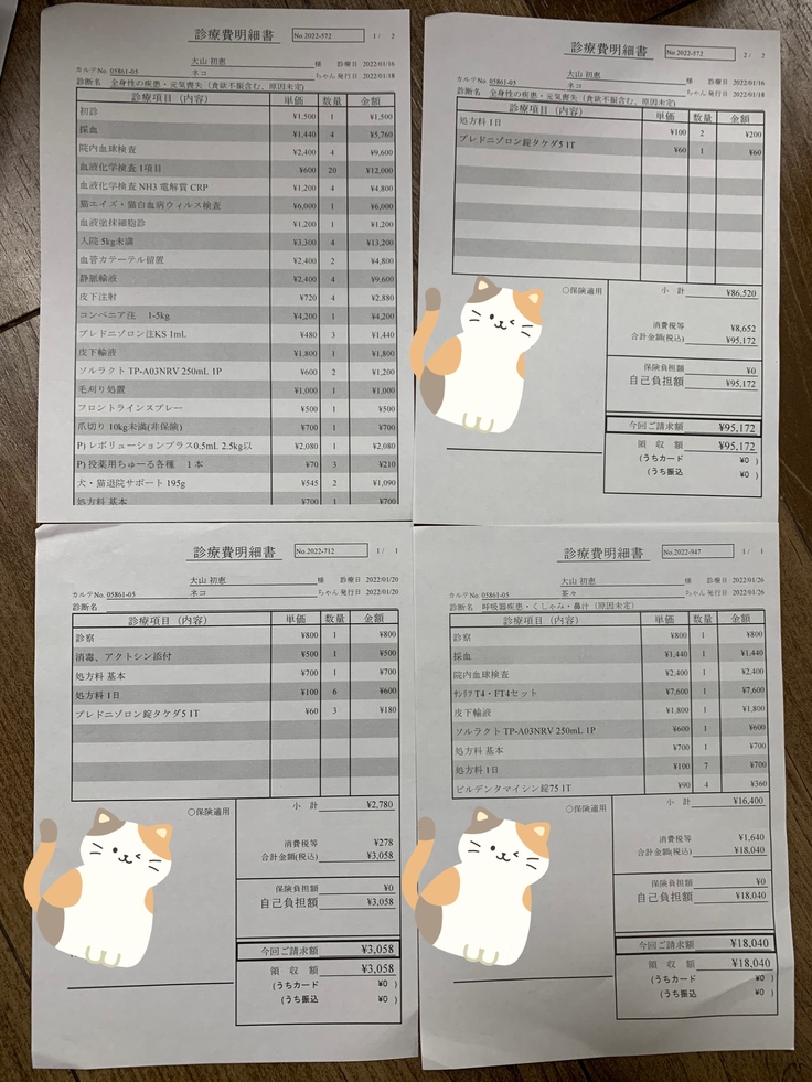 獣医師から、治療しても完治する可能性は低いけど、入院させるか、連れて帰るかの二択を選択させられました。しかし、連れて帰っても先が見えてしまっているので、獣医師に最善を尽くしてもらえるよう、お願いしました。