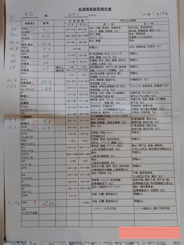 血液検査、SAA以外の項目はすべて異常ありませんでした。